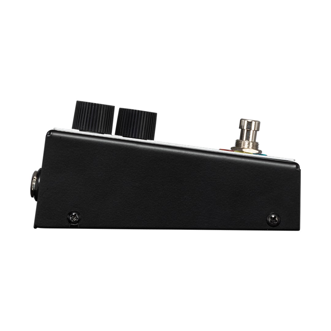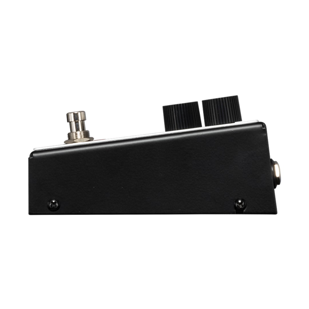 The built-in noise gate, activated by a top-panel toggle switch, reduces unwanted noise for clean, high-gain performance. Users can adjust the noise gate’s Threshold with the internal trim pot for tailored operation. The true bypass footswitch preserves signal integrity when the pedal is off and triggers the illuminated Maestro logo, ensuring visibility on stage. Power options include a 9V battery or regulated 9VDC power supply, making it reliable and road-ready. The input jack doubles as a power-on switch, preventing unnecessary battery drain when unplugged.