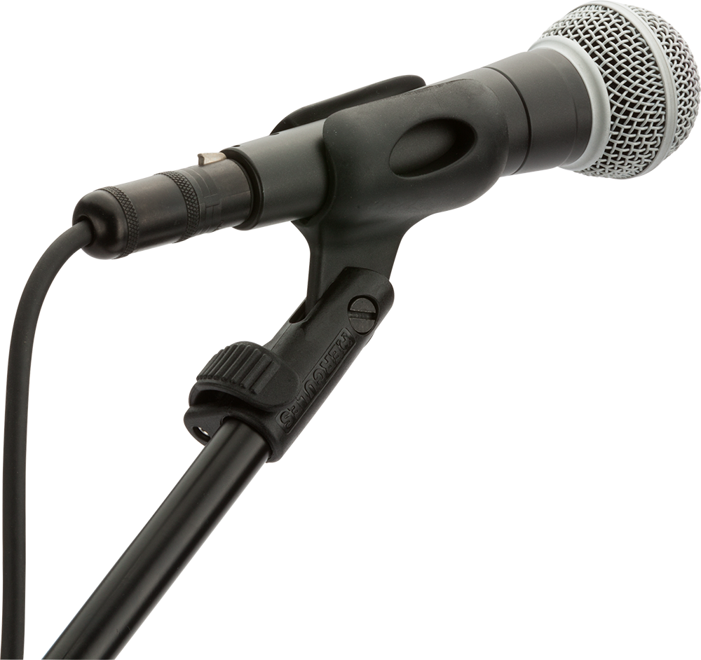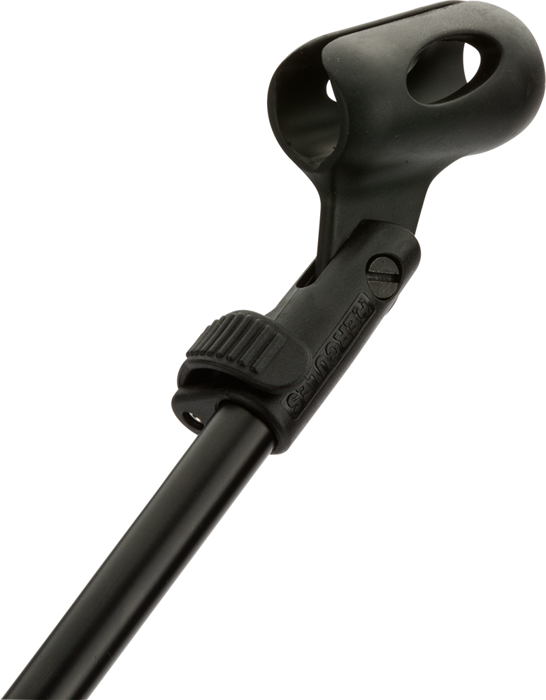 The HERCULES MH101B Microphone Holder is a secure, flexible clip designed to hold standard handheld microphones firmly in place. Featuring a swivel mechanism, it allows easy angle adjustment for optimal microphone positioning. Ideal for live performance, studio recording, and presentation environments.