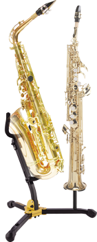 The HERCULES Saxophone Multi-Stand DS533BB features a folding yoke, an adjustable backrest, and locking pins that all safely and securely hold a Tenor or Alto Saxophone; includes an additional peg for a Soprano Saxophone.