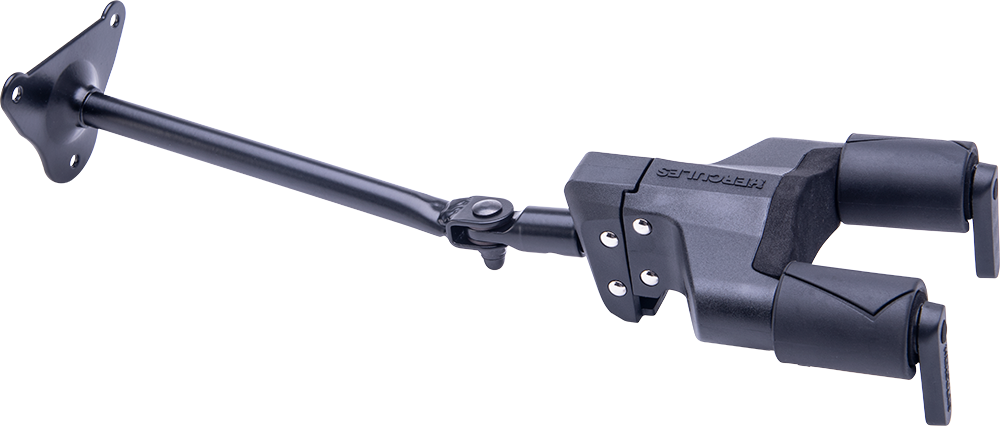 The HERCULES Auto-Swivel/Adjustable Yoke Hanger GSP40WB PLUS rotates to accommodate most guitars and pivots left or right so you can display the instrument facing various directions. It features a screw-in standard wall mounting system for display use.
