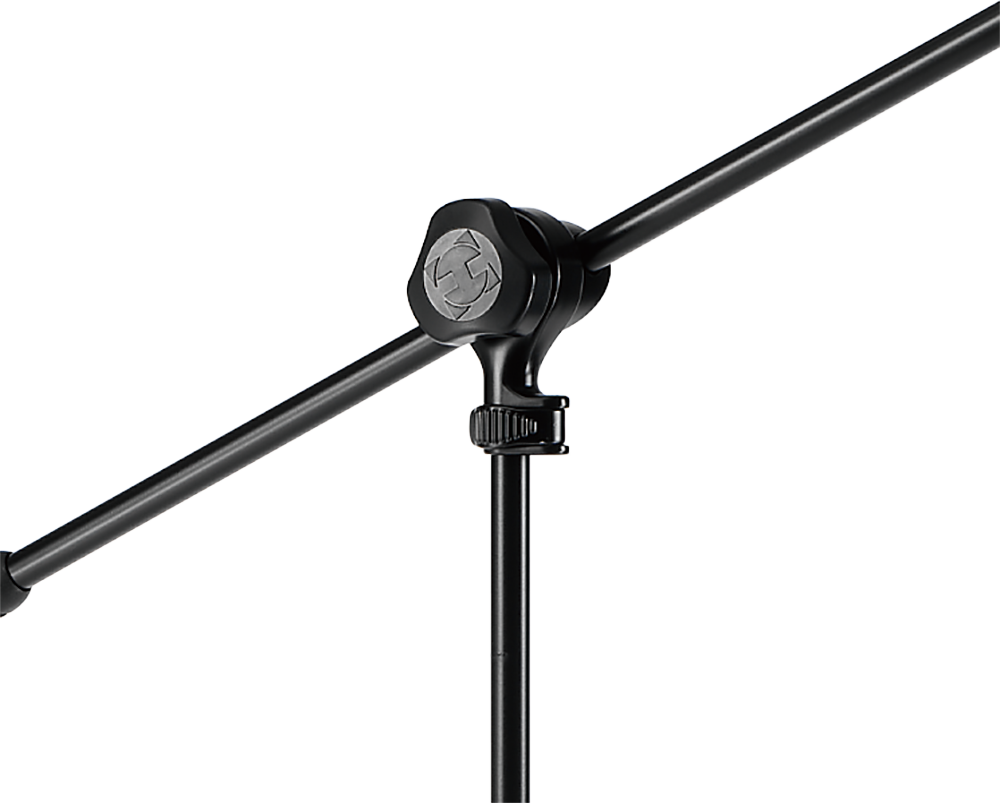 - The 2-in-1 Boom Clamp with Single Knob Adjustment safely secures boom length and angle.