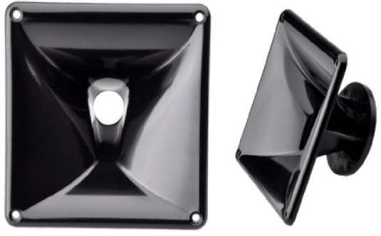 This plastic horn with flange is designed for use with compatible speaker units. It offers a durable and lightweight structure, ideal for various audio applications.
