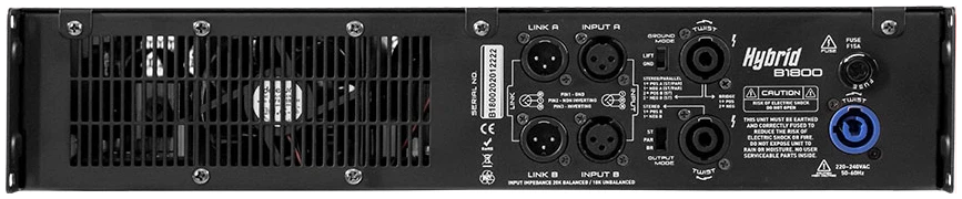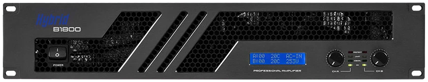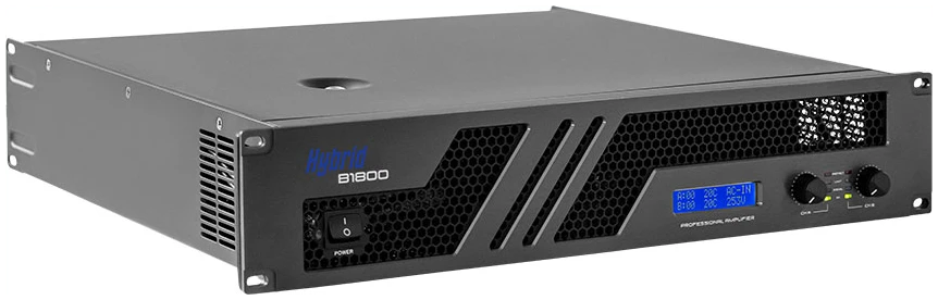 The Hybrid B2400 MK6 is a robust, 19″, 2U rack-space, 2 channel power amplifier with an onboard front panel LCD screen indicating channel gain, channel temperature and mains voltage, as well as front panel LED indication for signal, limit and protection.