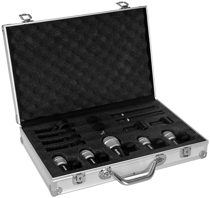 The set includes one kick drum mic, one snare mic, three tom mics, and two condenser overhead microphones, each optimized for its role in delivering a balanced, full-spectrum drum sound. The dynamic mics handle high sound pressure levels with ease, while the condenser mics capture natural cymbal and room ambience.