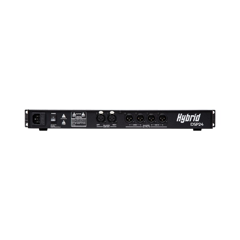 The Hybrid DSP24 is a professional digital loudspeaker management system designed for precise control of sound system tuning, crossover alignment, and speaker protection. Featuring 2 inputs and 4 outputs, it provides powerful DSP processing including EQ, crossover, limiter, delay, and phase control—ideal for PA systems, fixed installations, and touring rigs requiring accurate audio management and optimization.