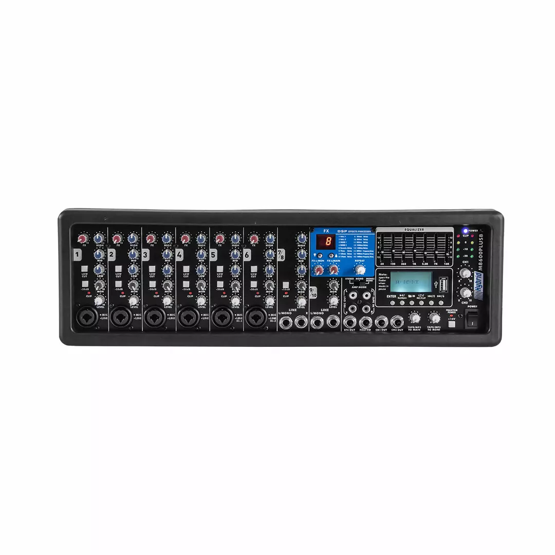 The Hybrid M8600PLUSB is a powerful and versatile 8-channel powered mixer combining a high-quality audio mixer, dual power amplifier, and built-in digital media player. Designed for live performances, mobile DJs, churches, and small venues, it features Bluetooth connectivity, USB/SD playback, and onboard digital effects – all housed in a rugged, portable chassis.
