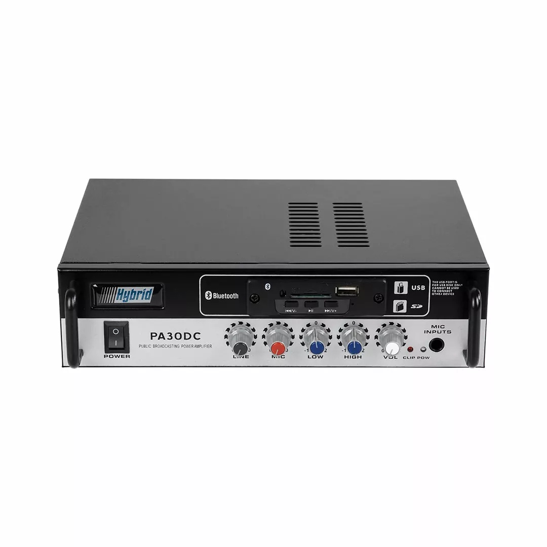 The Hybrid PA30DC is an entry level, well priced, small format public address amplifier that can be powered by either 220V mains or a 12V DC battery / power supply. The PA30DC is most commonly used as a mobile public address amplifier in a vehicle connected to horn speakers.