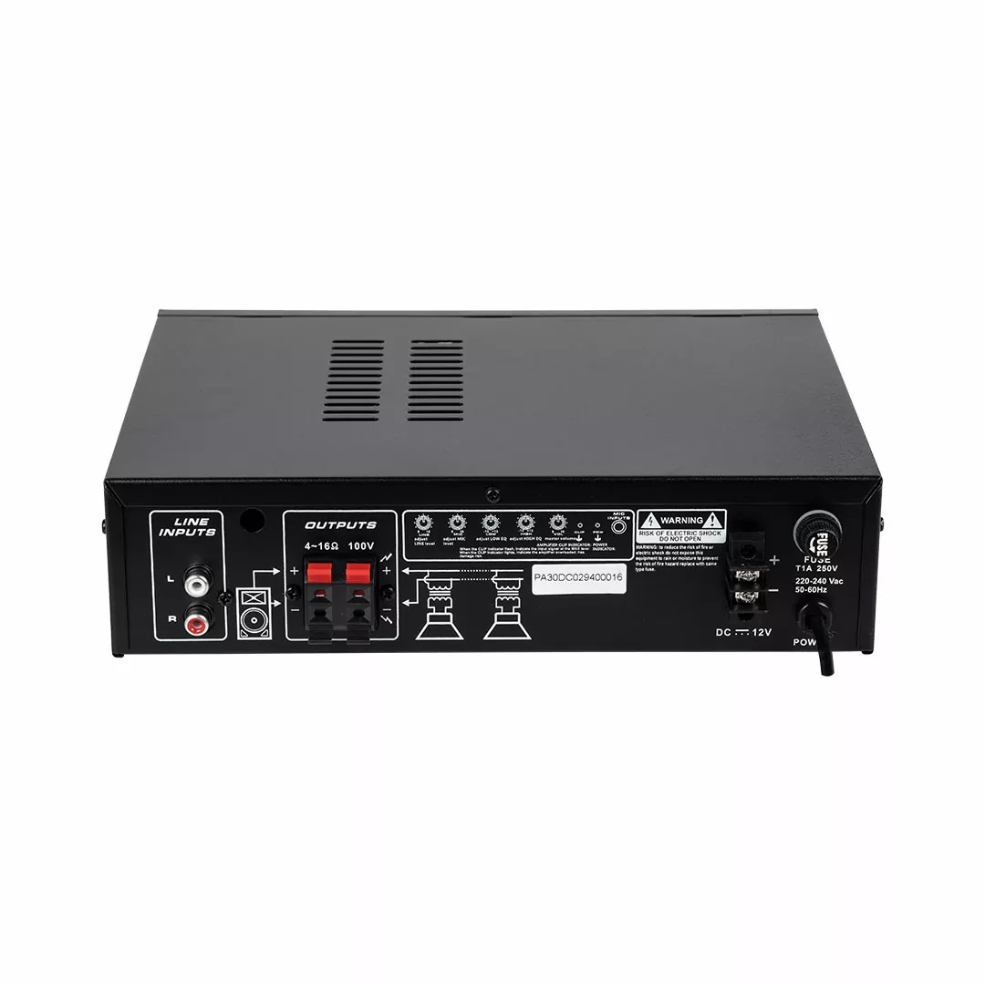 The PA30M 100V line output allows for numerous ceiling mount or other 100V line speakers to be connected using the same line over a long distance, simplifying the installation and reducing costs on wiring and labour.