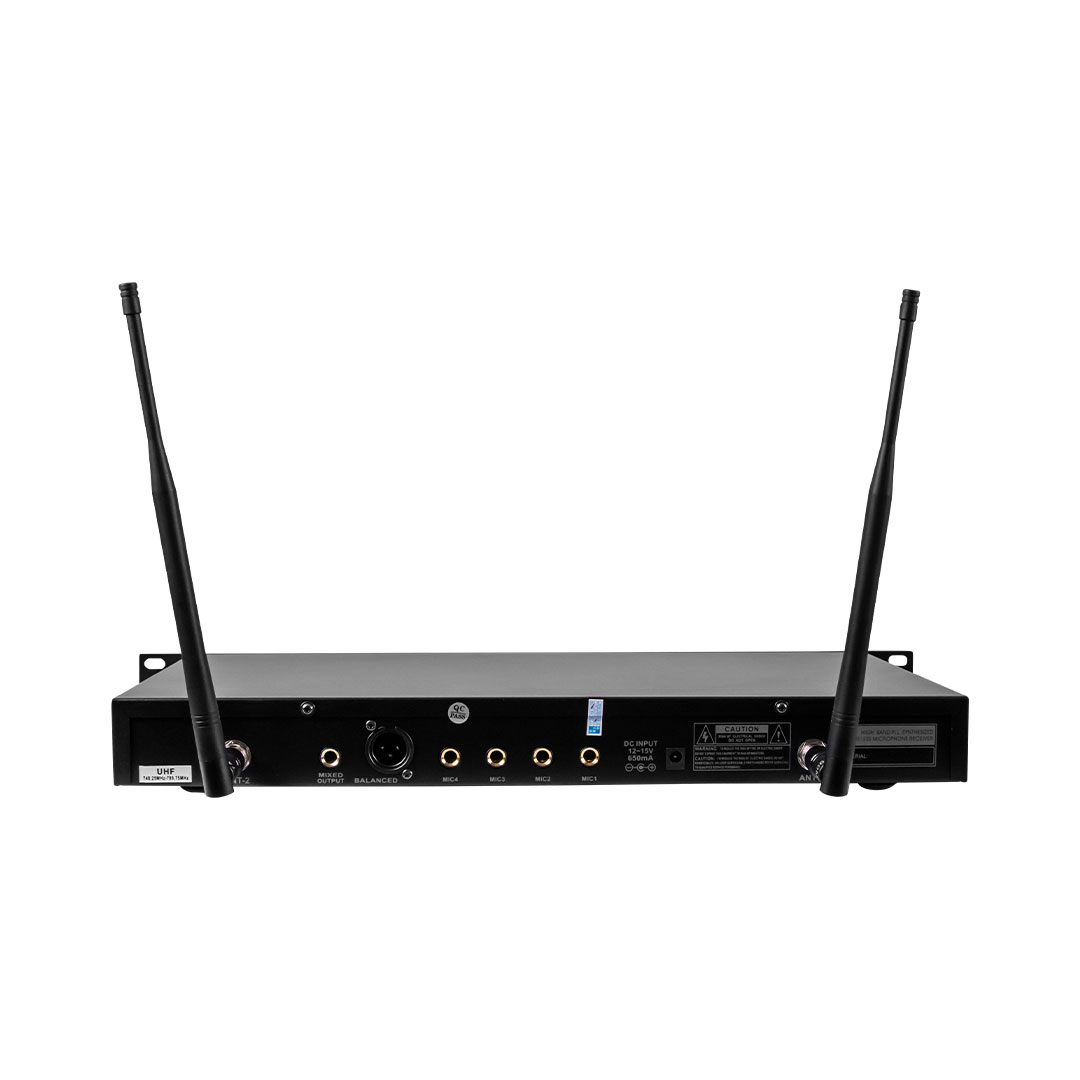 The Hybrid+ R4 is a UHF, multi-channel with 62 selectable frequencies per channel, microphone receiver that couples to the Hybrid+ TH1 (Handheld transmitter), Hybrid+ TB1 (Lapel/Headset transmitter) or the Hybrid+ TC1 (Desk top conference transmitter). The R4 receiver can accommodate up to four transmitters which are sold as separate units.