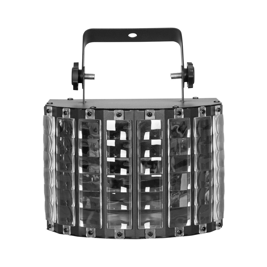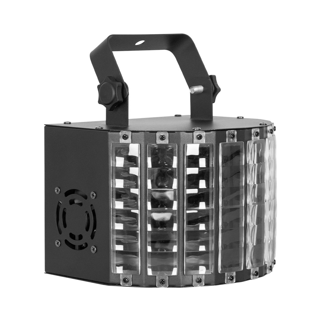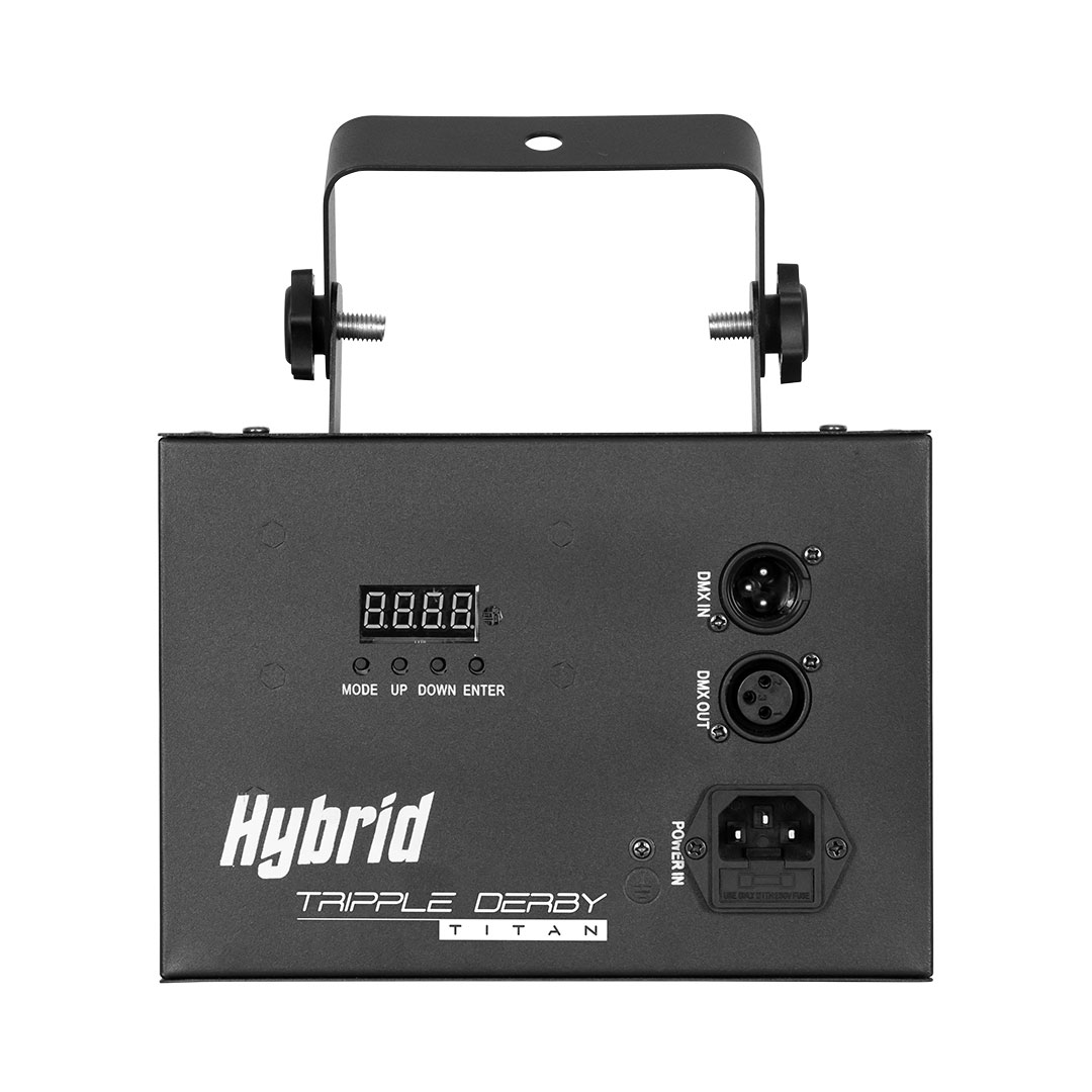 The Hybrid Triple Derby Titan spreads multicoloured, chasing beams throughout the room. This unit comes with increased flexibility due to the individual control of the red, green and blue LEDs within each of the clusters. It comes with the ability to activate built-in, automated programs in DMX mode and to easily access built-in, sound-activated programs in master/slave or DMX mode.
