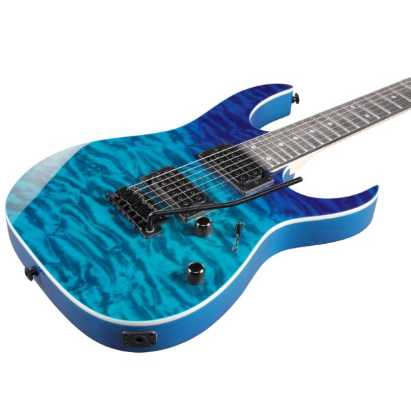 The GRG120QASP features an art grain quilted maple top on a poplar body bolted to a maple neck with a 24-fret purpleheart fingerboard with white dot position markers. Components include an Ibanez T102 two-point synchronized tremolo bridge, a pair of Ibanez Infinity R humbucking pickups, a plastic nut, and Ibanez die-cast tuning machines.
