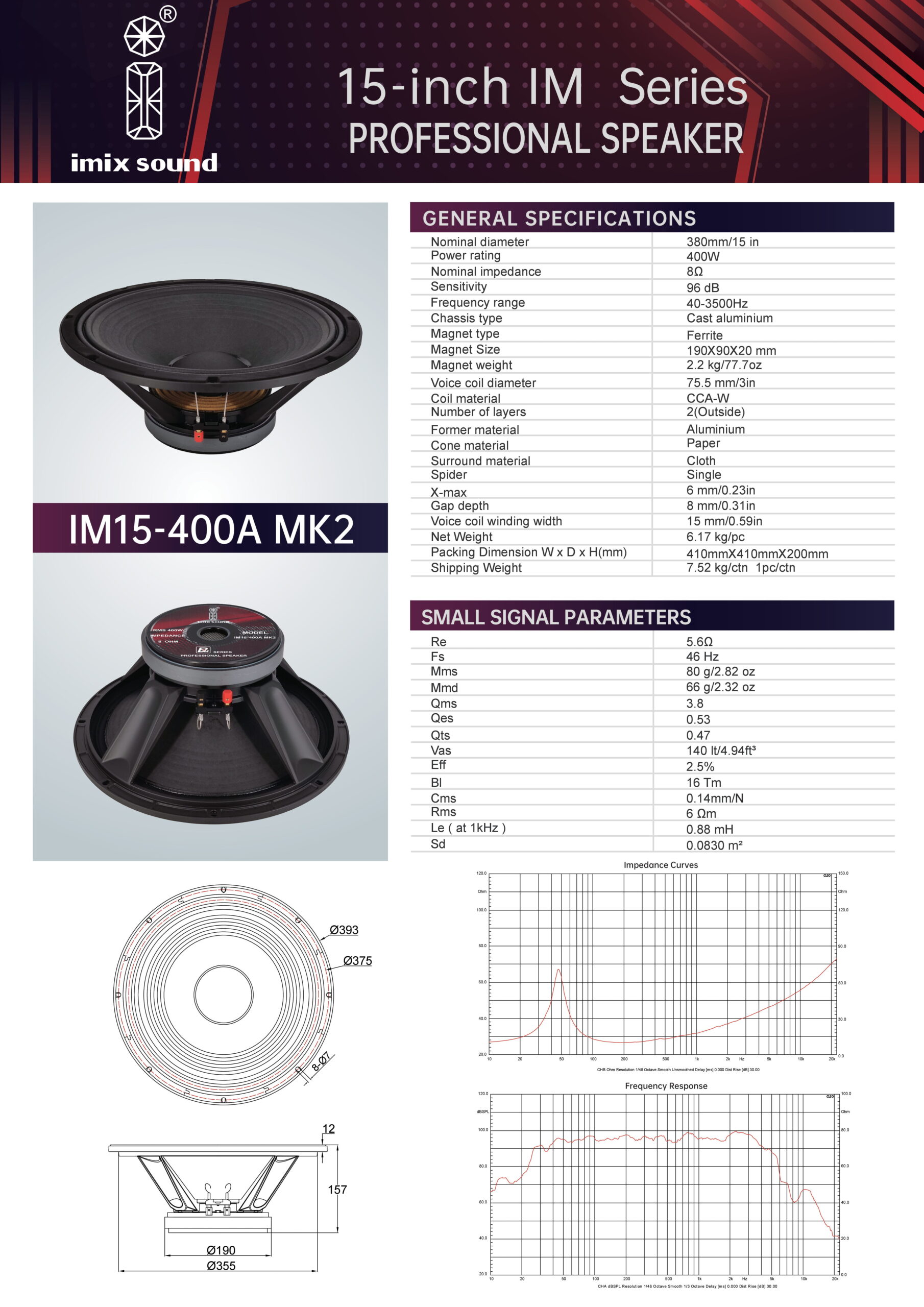 The Imix 15-400A MK II Loose Speaker is a high-performance 15-inch speaker designed for both professional audio applications and audiophiles seeking powerful, clear sound. Featuring a robust design and exceptional power handling, the 15-400A MK II delivers deep, punchy bass and smooth mid-range frequencies with impressive clarity, making it ideal for live sound reinforcement, studio monitors, or custom speaker builds.