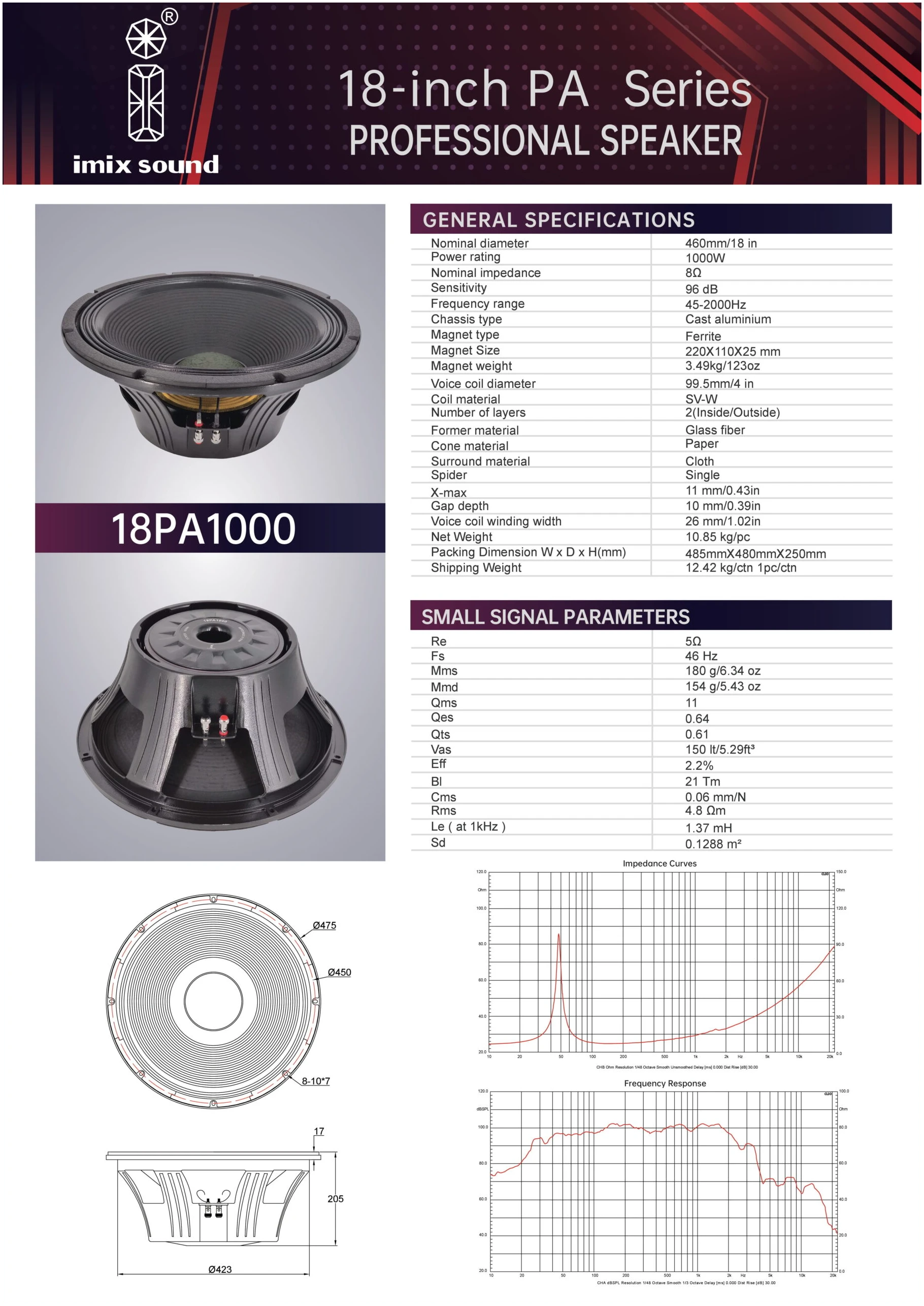 The Imix 18PA1000 Loose Speaker is a high-performance 18-inch speaker designed for both professional audio applications and audiophiles seeking powerful, clear sound. Featuring a robust design and exceptional power handling, the 18PA1000 delivers deep, punchy bass with impressive clarity, making it ideal for live sound reinforcement, studio monitors, or custom speaker builds.