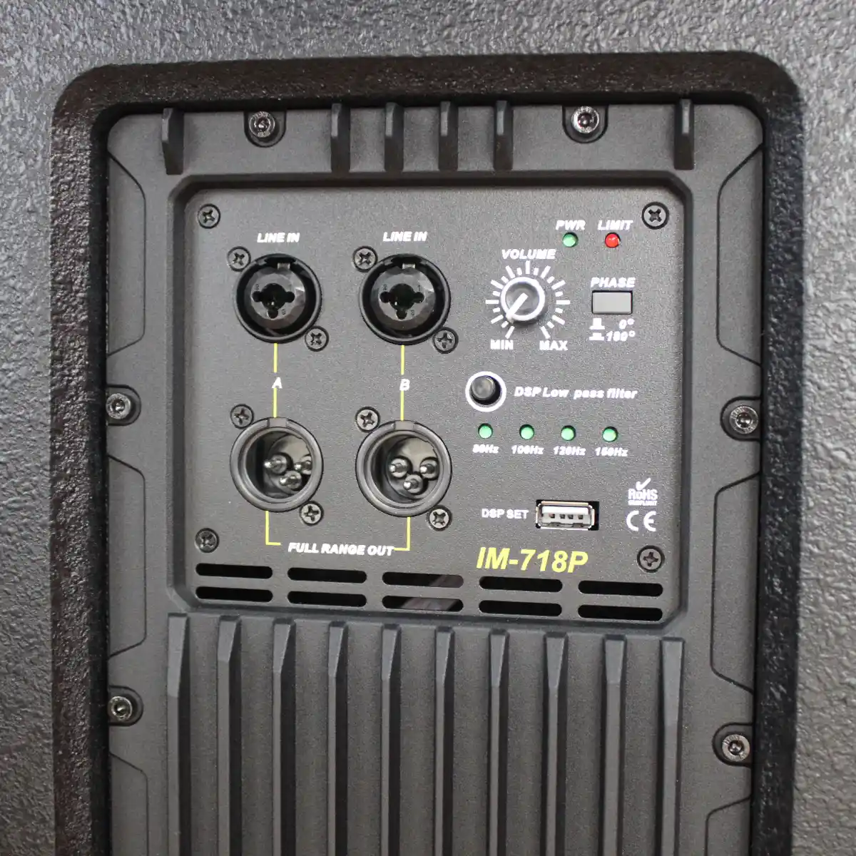 The IMIX 718P is an 18-inch active subwoofer designed for high-performance bass reproduction in both professional audio and entertainment settings. It features a powerful 18-inch woofer that delivers deep, impactful low-end frequencies, making it ideal for use in live sound systems, DJs, and large venues. The subwoofer is powered by an integrated class D amplifier, which efficiently drives the driver with impressive power, typically around 1200W RMS or higher, providing the necessary output for large events. With a built-in crossover and low-pass filter, the IMIX 718P ensures that only the appropriate low frequencies are directed to the subwoofer, while the rest of the sound spectrum is handled by other speakers. The subwoofer’s robust MDF enclosure offers durability and excellent resonance control, and it includes a range of connectivity options such as XLR and RCA inputs/outputs for seamless integration into various audio setups. The IMIX 718P is ideal for professional audio applications that demand high-quality, deep bass for dynamic sound reproduction.