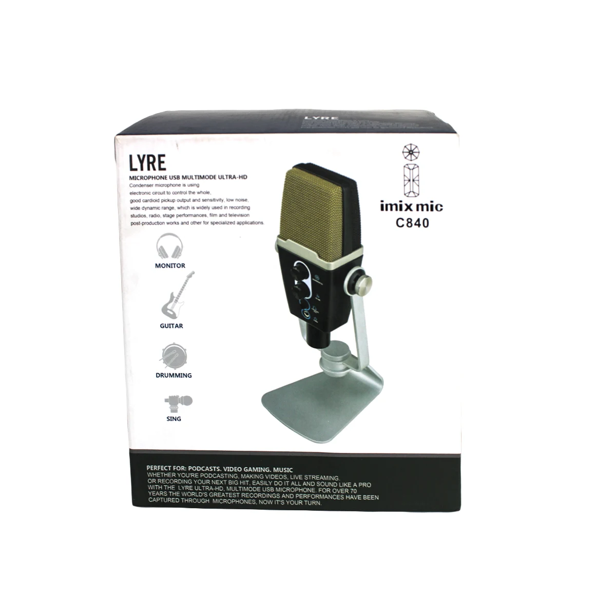 he Imix IMC840 USB Desk Condenser Microphone is an Ultra-HD multimode USB microphone designed for professional-grade audio capture. Featuring a high-quality condenser capsule with advanced electronic circuitry, it delivers crystal-clear sound with low noise, wide dynamic range, and excellent sensitivity. Its cardioid pickup pattern ensures focused audio recording while minimizing background noise, making it perfect for podcasting, streaming, vocals, voiceovers, and music production.