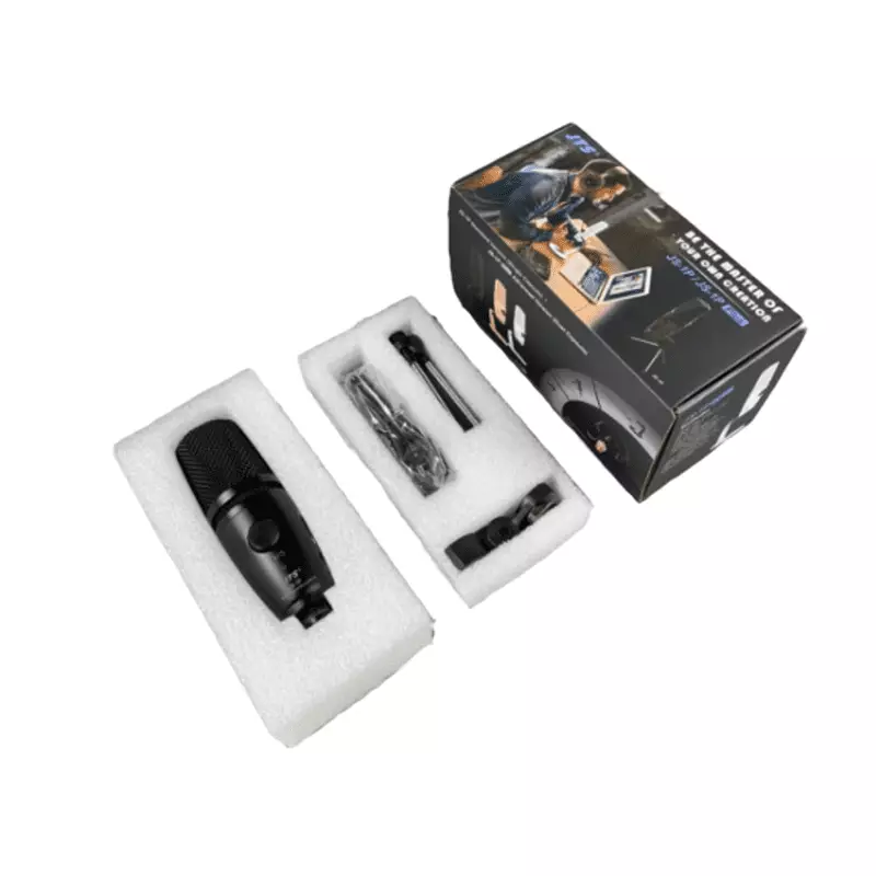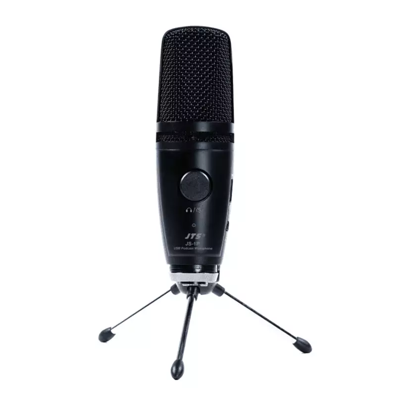 The JS-1P is a USB Condenser Microphone with a High Sensitivity cardioid pickup pattern that makes it perfect for Podcasts, on-line video calls as well as live and recorded applications. It is supplied with a USB A-B cable together with a small threaded stand for desktop standing. The integrated headphone jack allows monitoring of the JS-1P microphone and the audio from the computer at the same time with a blend and volume control to mix the signals. The instant mute function allows for instantaneous muting of the microphone