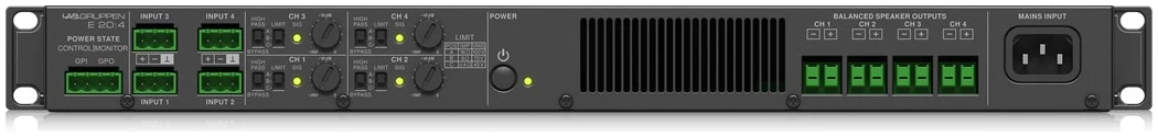 The amplifier includes a Rail Sense Limiter (RSL) that prevents signal clipping and simplifies configuration for both constant voltage and low impedance loads. Additionally, it features a built-in 50 Hz high-pass filter, temperature-controlled fan, and balanced analog inputs and outputs. The E20:4 also provides GPIO connectors for remote power control and monitoring, enhancing its integration capabilities.