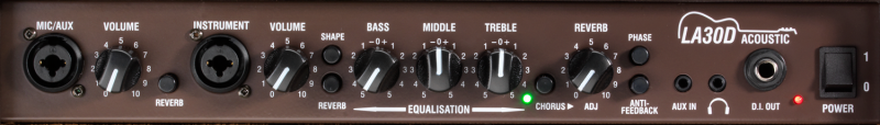 The LA30D is compact yet packed for performance. Two independent input channels both offer the choice of balanced XLR or unbalanced jack inputs and both can have Reverb assigned to them as required. This flexibility allows for connection of a mic and instrument, two different acoustic instruments or even a blend of separate mic and pickup connections from the same instrument. The LA30D delivers full, natural acoustic sound-reproduction with plenty of high-end sparkle.