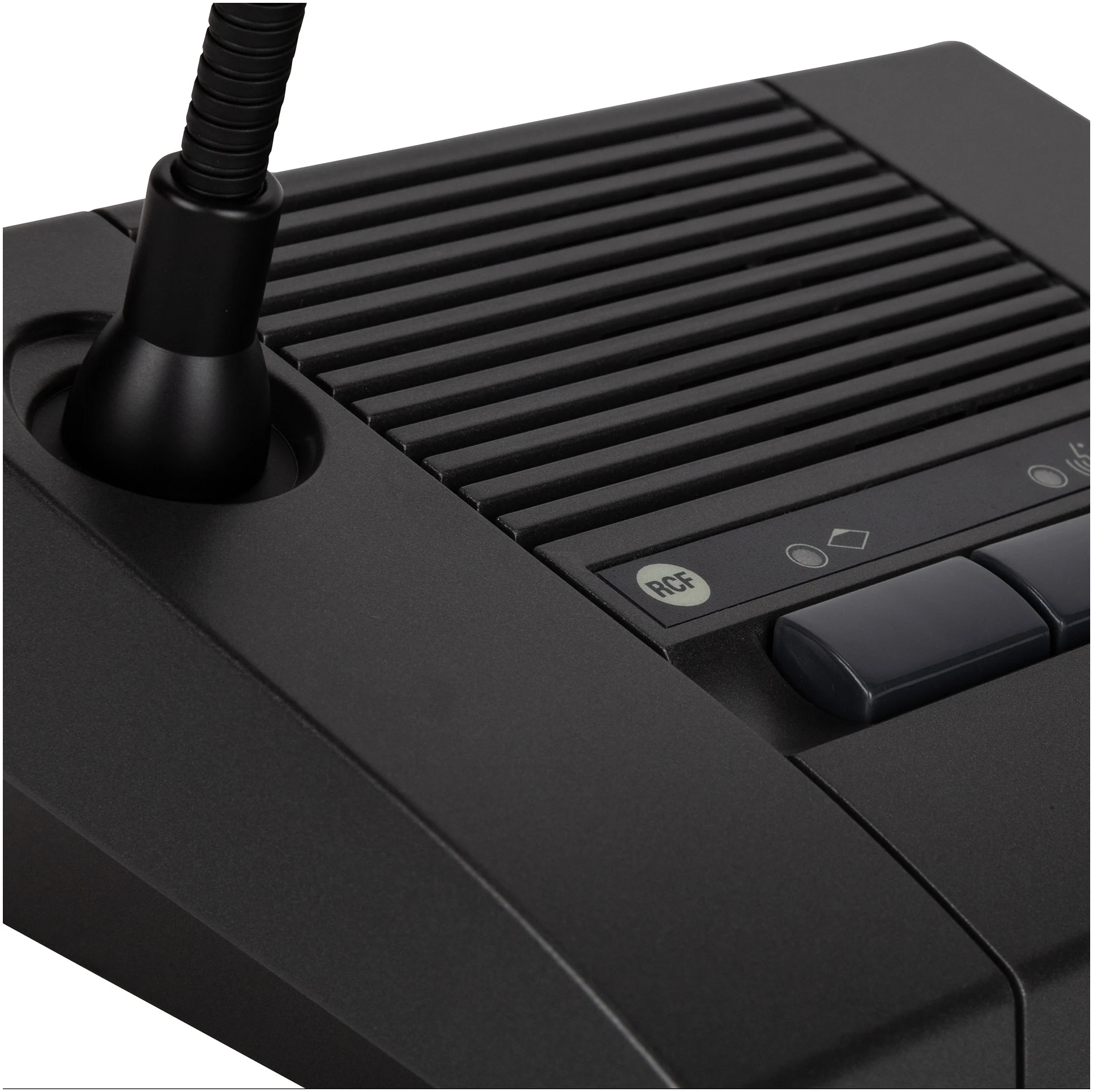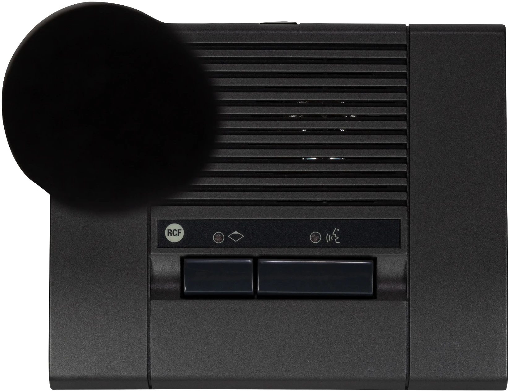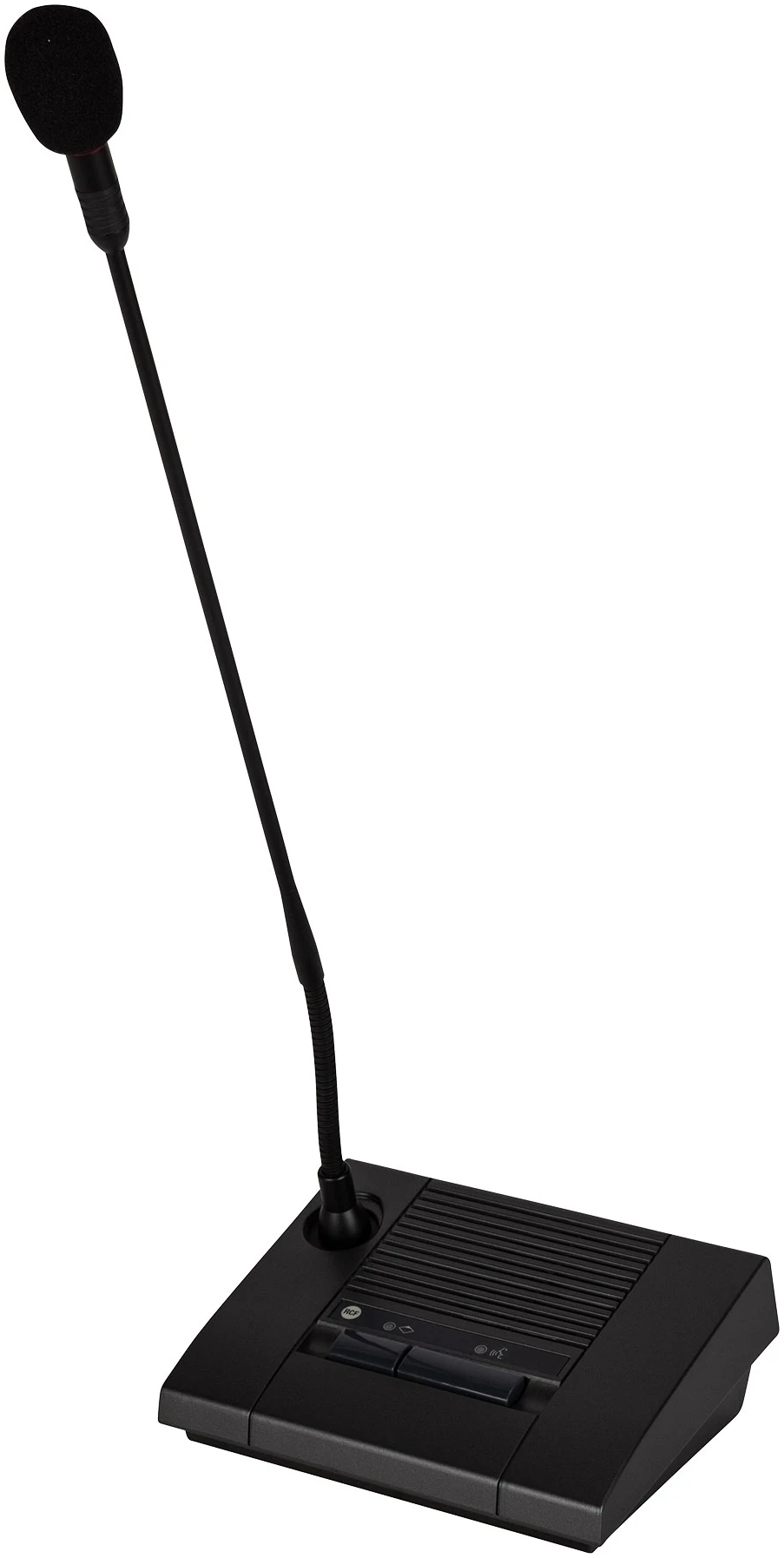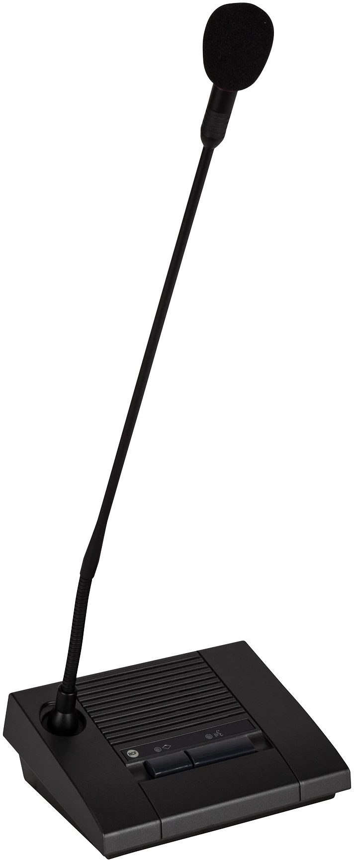 The desk-top chairman microphone console MMS 3405P features two buttons: a latched button to enable the microphone in mixed mode with other active MMS 3404D delegate microphone consoles, and a momentary push button to get the microphone working in priority mode on delegate ones, that stay off till the button has been is released. This function allows the chairman to take the absolute control of the speech. Each button is completed with a LED indicator, lit when pressed. Furthermore the microphone capsule has an LED ring that is ON when the microphone is active. The 46 cm gooseneck microphone mounted on the console has a cardioid pattern, while the miniature high quality transducer assures a good sound reinforcement in small size rooms without needing an additional sound reinforcement system. Two or more MMS 3405P can be cascaded by keeping cascaded priority precedence, over than preserving mixed speech option facility. MMS 3405P is wired directly to the dedicate input of the MMU 3100 unit by means of CAT 5FTP cable provided.
