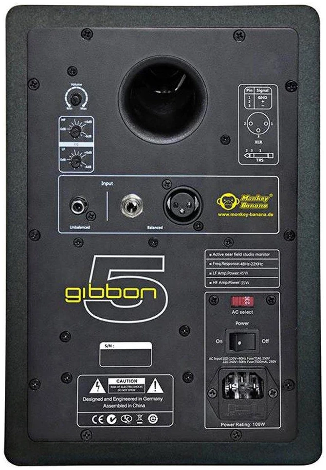 Monkey Banana Gibbon 5 is an active near field monitor for the ambitious home studio or for editing suites in broadcasting studios. With this digital bi-amp-powered loudspeaker, you achieve perfect mixes in small scale monitoring environments.
