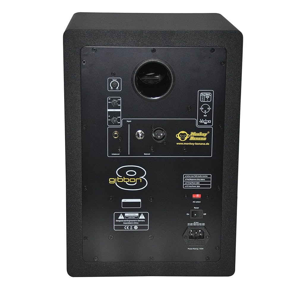 Monkey Banana Gibbon 8 is an active near field monitor for home studios and professional recording studios. The digital-bi-amp-powered loudspeakers enable perfect mixes in medium to large monitoring environments. Due to the significant downward extension of the low-end frequency range, the Gibbon 8 is the ideal DJ-monitor as well. The monitor also provides HIFI-pleasure in large living rooms or for gamers.