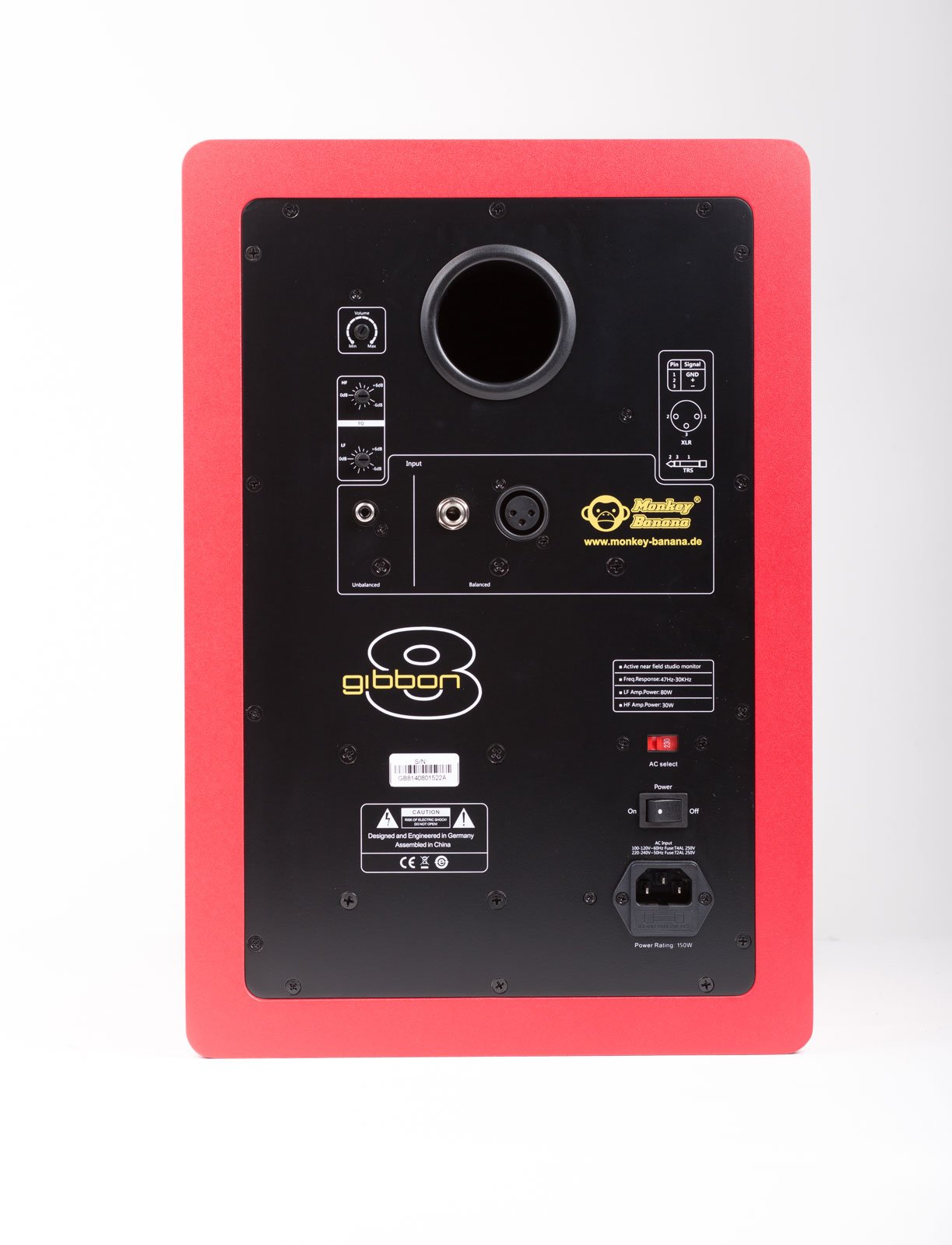 Monkey Banana Gibbon 8 is an active near field monitor for home studios and professional recording studios. The digital-bi-amp-powered loudspeakers enable perfect mixes in medium to large monitoring environments. Due to the significant downward extension of the low-end frequency range, the Gibbon 8 is the ideal DJ-monitor as well. The monitor also provides HIFI-pleasure in large living rooms or for gamers.