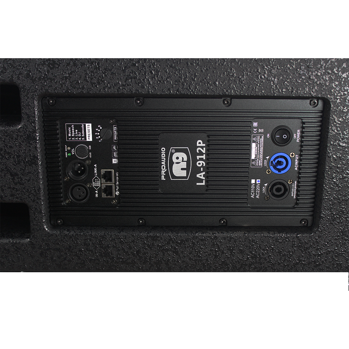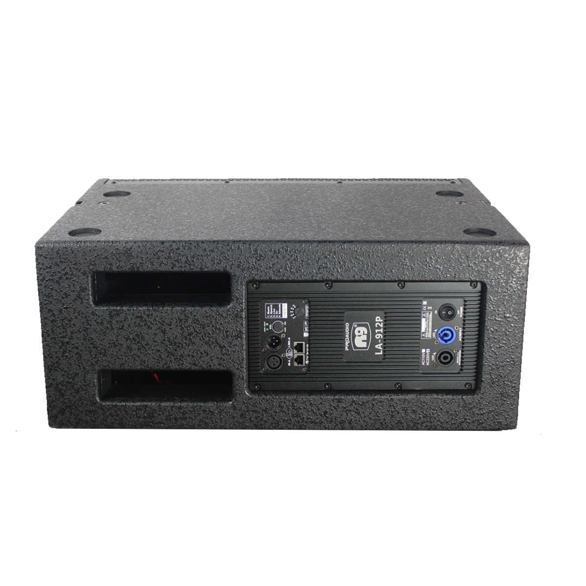 Rugged enclosure with a black steel grille and textured coating for stage-ready durability. -