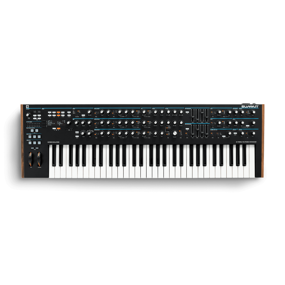 The Novation Summit is a flagship 16-voice, bi-timbral polyphonic synthesizer that combines the power of two Novation Peak engines into a premium 61-key performance keyboard. Built for sound designers, producers, and performers, the Summit delivers deep synthesis, warm analog tone, and extensive modulation options — making it a true centerpiece for any modern studio or live setup.