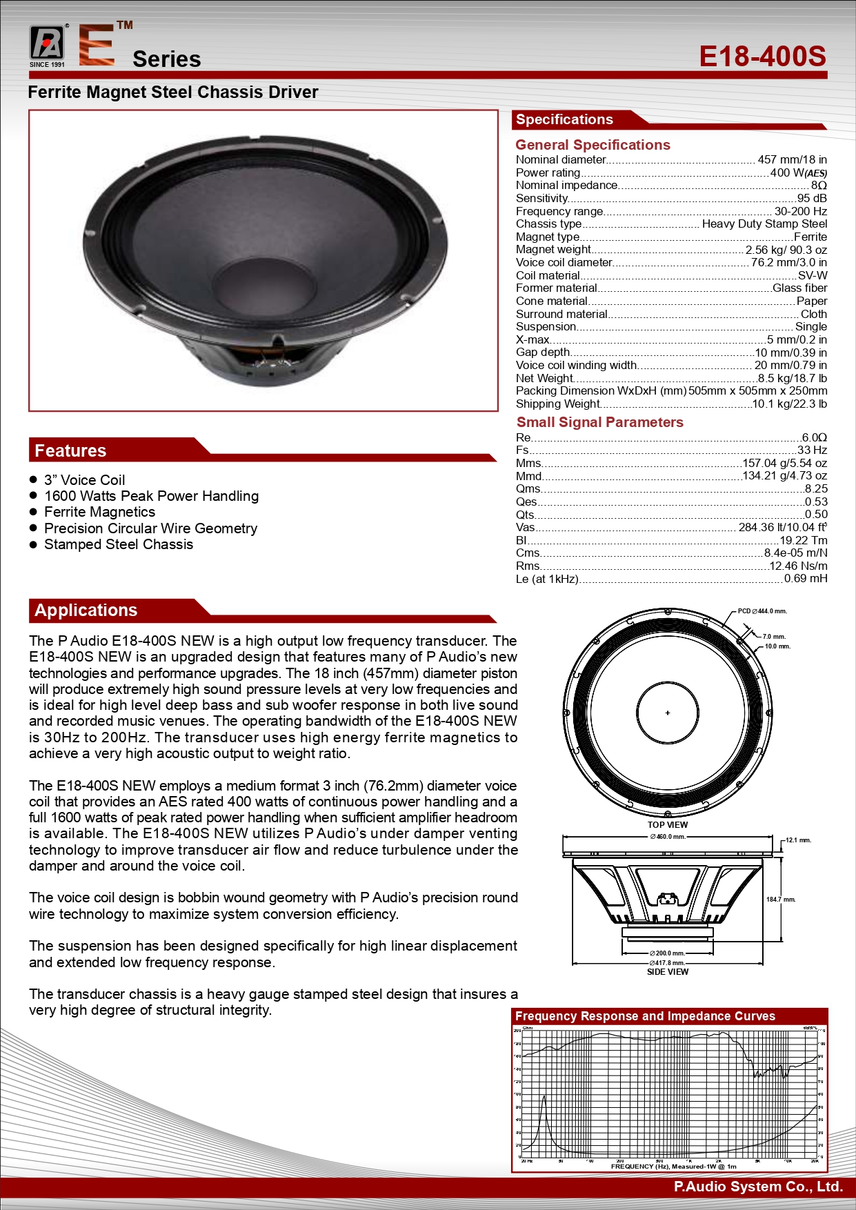 The P Audio E18-400S NEW is a high output low frequency transducer. The E18-400S NEW is an upgraded design that features many of P Audio\’s new technologies and performance upgrades. The 18 inch (457mm) diameter piston will produce extremely high sound pressure levels at very low frequencies and is ideal for high level deep bass and sub woofer response in both live sound and recorded music venues. The operating bandwidth of the E18-400S NEW is 30Hz to 200Hz. The transducer uses high energy ferrite magnetics to achieve a very high acoustic output to weight ratio.