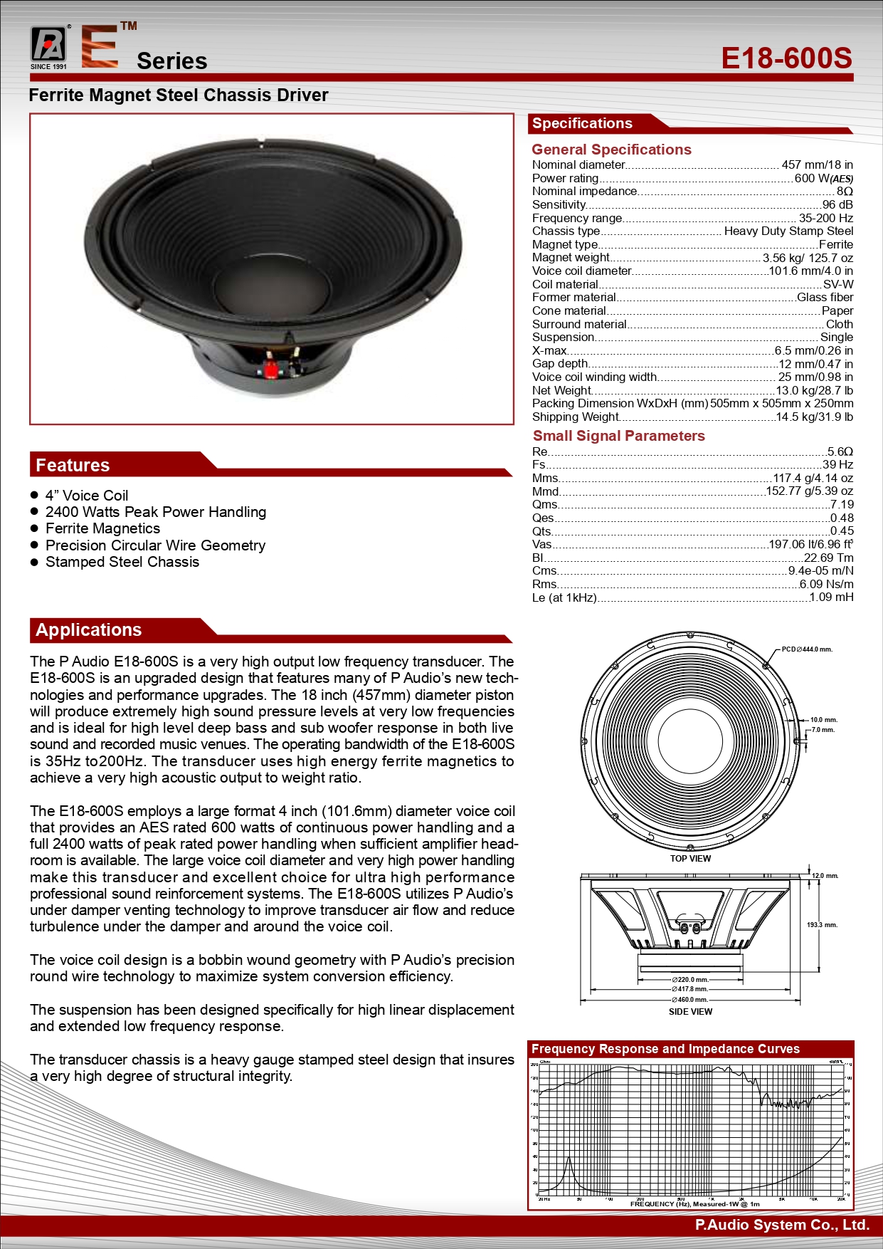 The P Audio E18-600S is a very high output low frequency transducer. The E18-600S is an upgraded design that features many of P Audio\’s new technologies and performance upgrades. The 18 inch (457mm) diameter piston will produce extremely high sound pressure levels at very low frequencies and is ideal for high level deep bass and sub woofer response in both live sound and recorded music venues. The operating bandwidth of the E18-600S is 35Hz to200Hz. The transducer uses high energy ferrite magnetics to achieve a very high acoustic output to weight ratio.