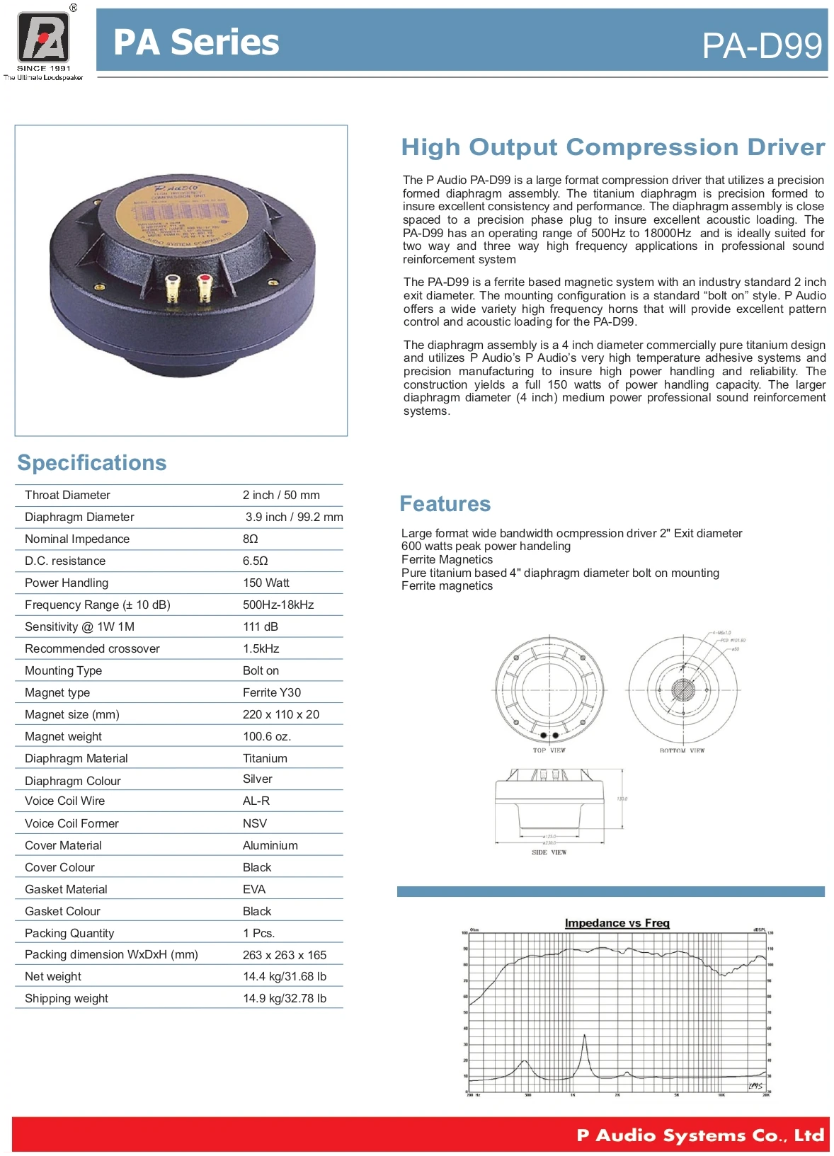 | Diaphragm Diameter | 3.9 inch / 99.2 mm |