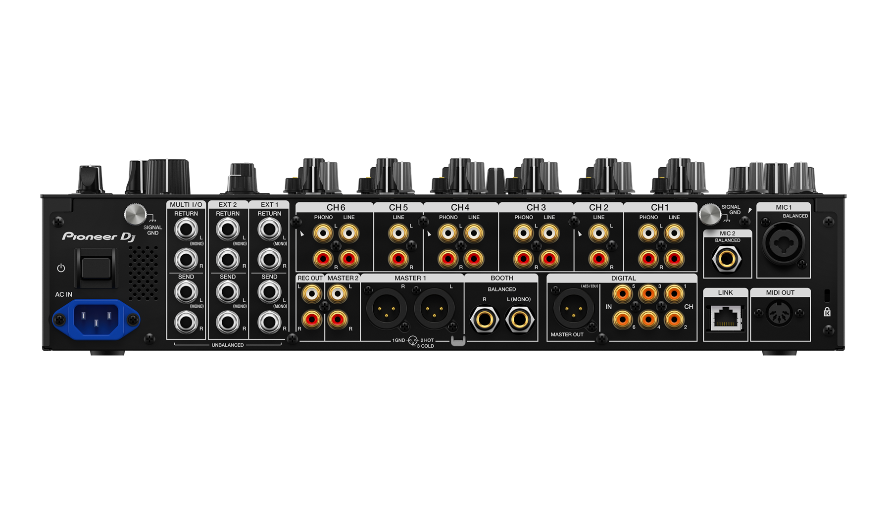 - Outputs: 2 Master (XLR, RCA), 1 Booth (1/4″ TRS), 4 Headphone (1/4″, mini-jack), 1 Rec Out (RCA), 1 Digital (AES/EBU)