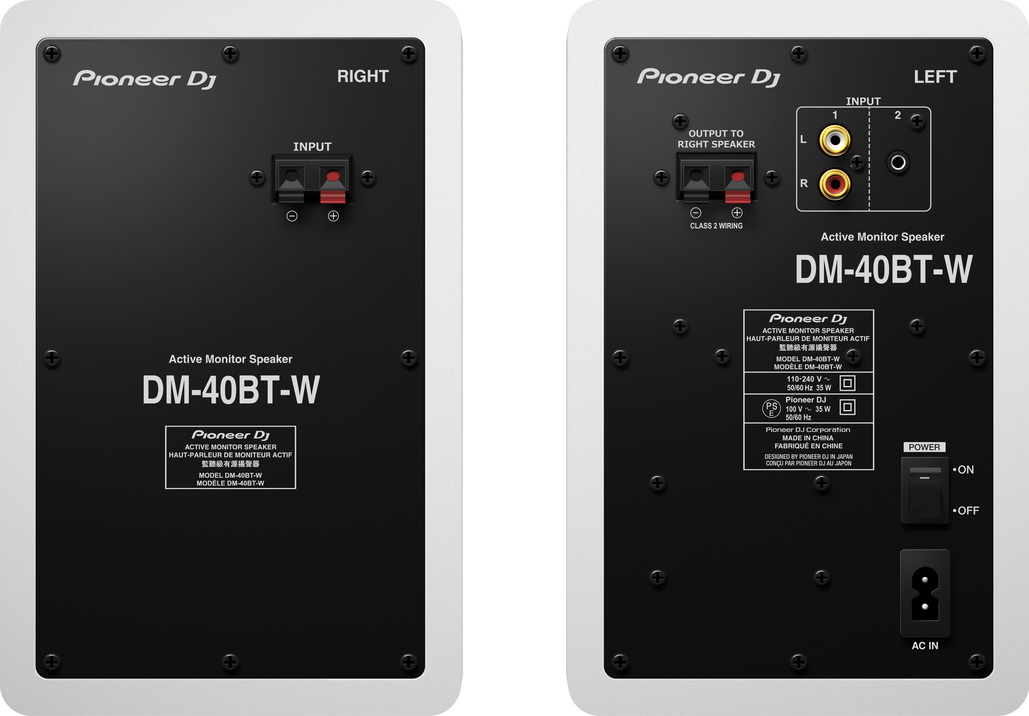 Accessories: DM-40BTW ×2, power cord, 2m speaker cable, audio converter cable (3.5mm to RCA), bottom cushions ×8, operating instructions.