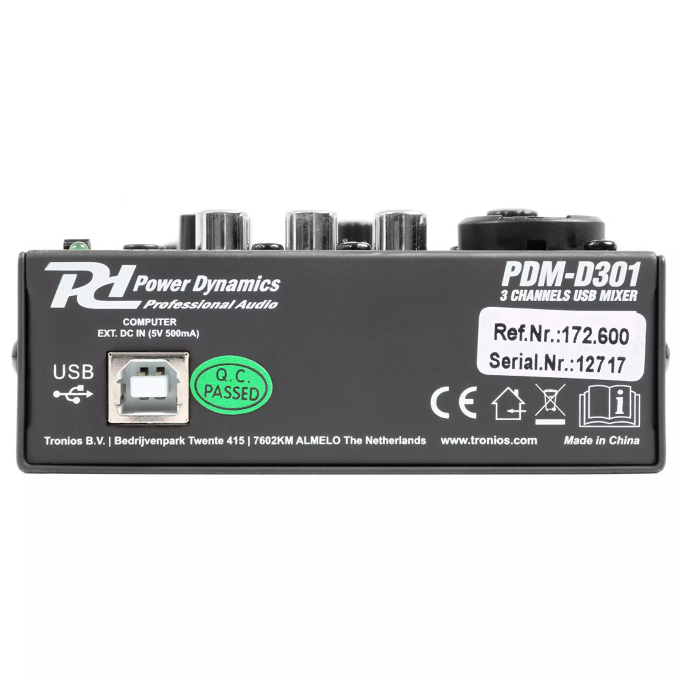 The PDM-D301 3-channel USB mixer with sound card is unique because its features cannot be found in any other device of its size. The mixer contains 1 mono and 1 stereo input channel with both a 2-way equalizer for the high and low controls. Further the mixer has tape inputs assignable to the main mix. The build-in USB sound card provides also the power for the mixer.