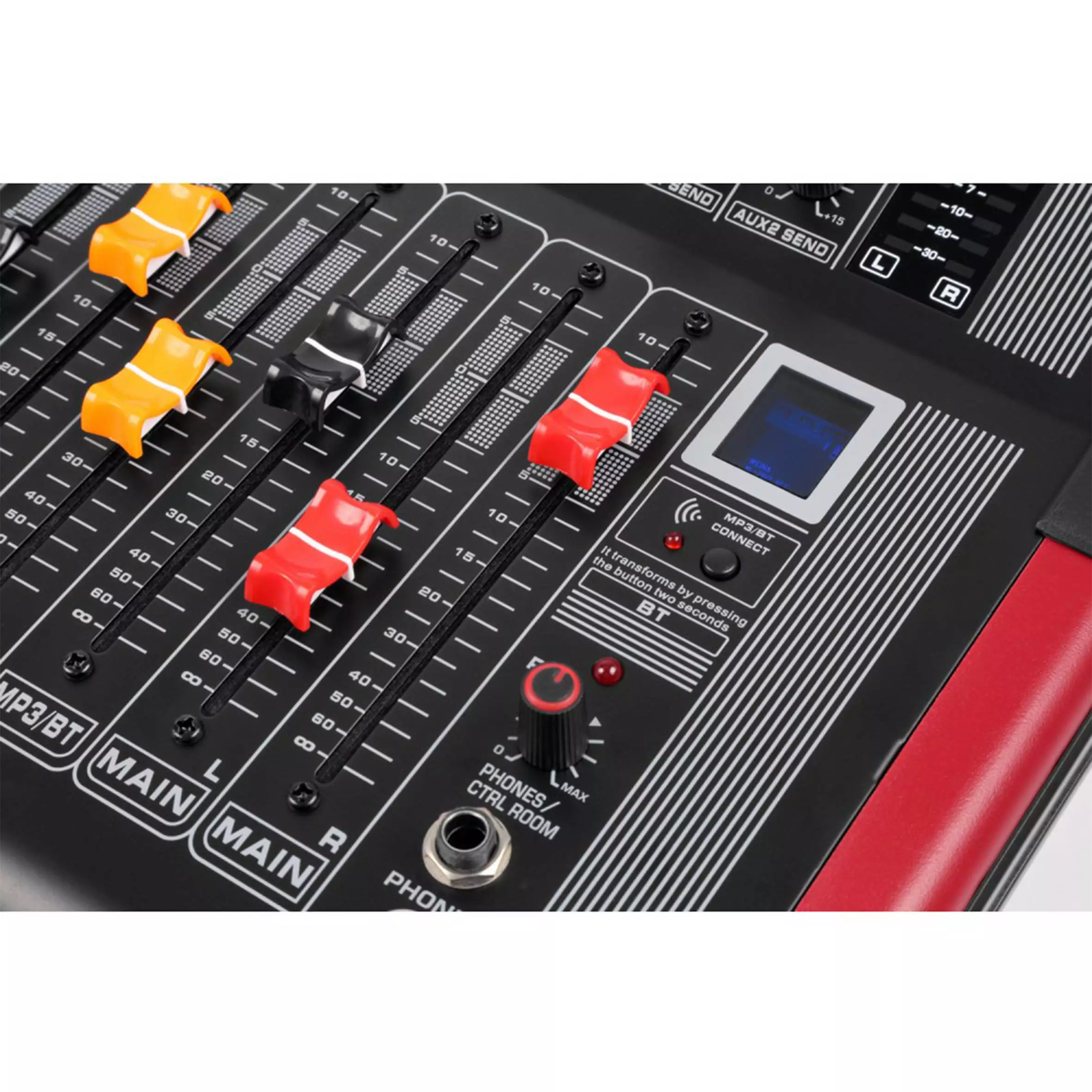 Table top design stage mixer with built-in amplifier and many attractive features. Features include mute and solo switches on every channel, built-in USB player with digital display and BT receiver.