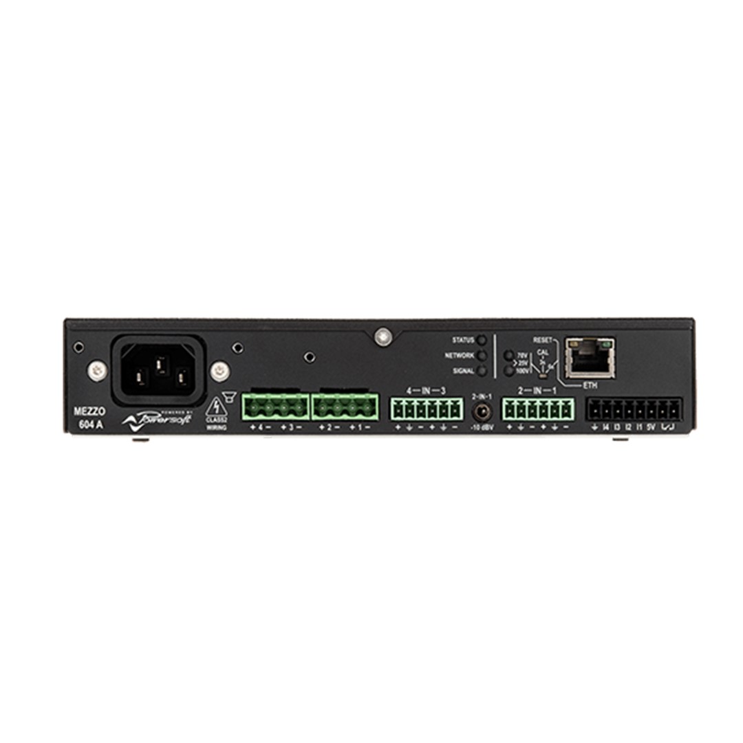 This feature ensures it fits seamlessly into any environment, whether in a small venue or a larger installation. The amplifier supports power-sharing, enabling efficient power distribution without compromising performance. Additionally, the remote control feature enhances usability, allowing users to manage vital functions via third-party controls. This capability facilitates seamless integration into existing systems, improving the overall user experience. The MEZZO 604A boasts robust build quality, ensuring durability for demanding applications.