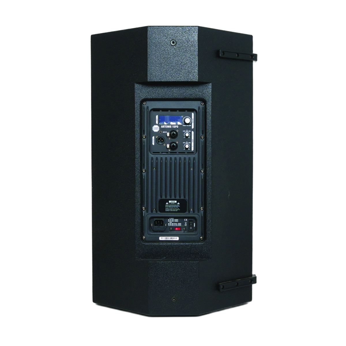 The graphic back-lit display simplifies DSP configuration, allowing users to adjust settings easily. The ARTEMIS 15PD functions as a floor monitor with 30° and 45° angles. It can be mounted on a tripod or flown using integrated M8 points, providing versatile setup options for any event. Its robust plywood construction features an anti-scratch black finish, making it suitable for demanding environments. Multiple input connections, including two combo XLR and 1/4″ jacks, ensure reliable integration into various audio systems. Weighing 28.2 kg, this speaker balances portability with professional performance, making it perfect for venues, events, and touring professionals seeking high-quality sound.