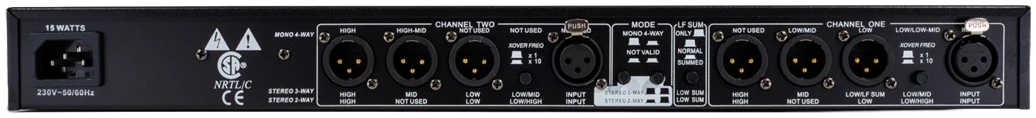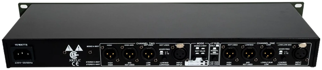 The frequency bandwidth ranges from 45Hz to 9600Hz for both channels and 450Hz to 9600Hz for specific settings. This range guarantees clear and impactful sound. Face panel indicators, including low-cut, phase invert, mono/stereo, and frequency multiplier LEDs, offer clear real-time feedback on settings. The back panel includes controls for mono/stereo switching, low-frequency summing, and frequency multiplication, enhancing the crossover’s versatility.