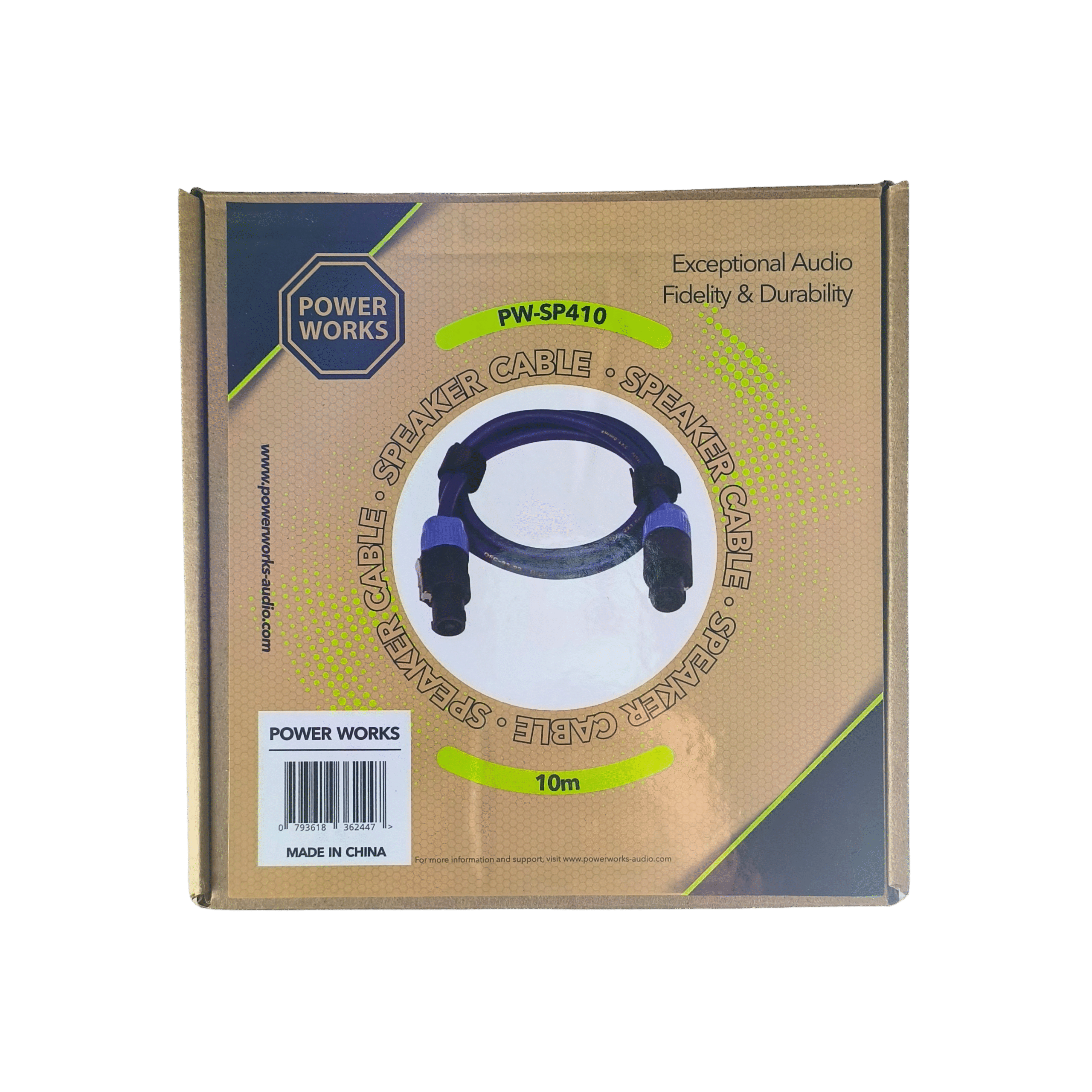 The PowerWorks PW-SP410 10M Speakon to Speakon Cable designed for professional audio systems. It features a unique locking mechanism that secures the connection, reducing the chance of accidental disconnections during performances. The cable uses 99.99% Oxygen-Free Copper (OFC) conductors, which minimize signal loss and ensure clear, uninterrupted sound.