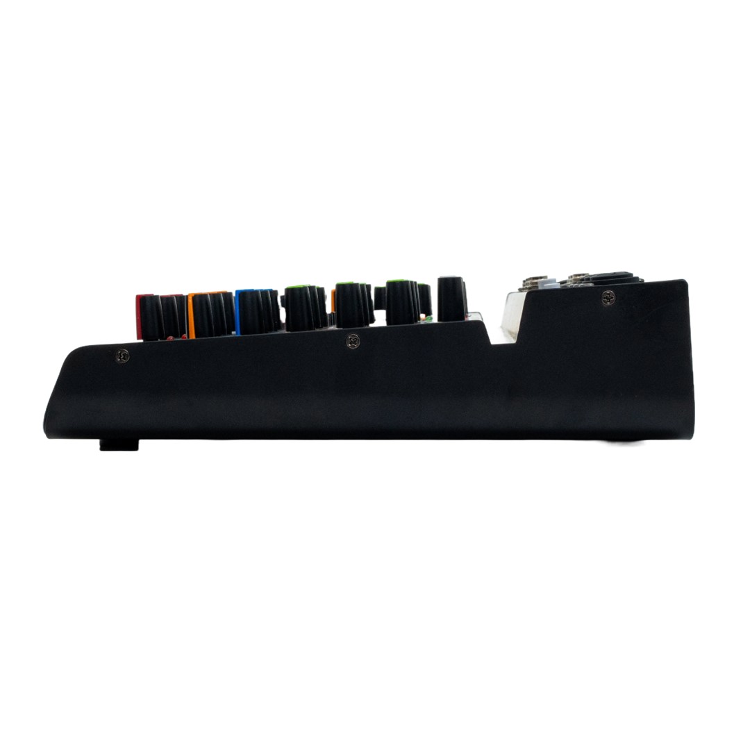 In addition to its robust channel features, the R602BTU includes two mic inputs, providing flexibility for vocal and speech applications. Users can enhance their audio with 16 built-in DSP effects, adding depth and texture to their sound. The single aux send allows for integration with external effects processors or for creating monitor mixes. Compact yet powerful, the mixer’s dimensions of 240 x 207 x 37 mm make it a portable choice for any setup where space is limited.