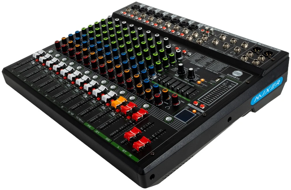 Additionally, the X2004BTU has a 26dB attenuation switch per mono channel, allowing precise control over input levels to prevent distortion. The EQ control includes a 4-band EQ for mono channels and a 3-band EQ for stereo channels, which lets you shape your sound with precision. Mute switches on each channel enable quick management of individual signals, while two sets of AUX outputs and one FX output offer versatile routing options. This allows for effective external effects processing and monitor mixes.