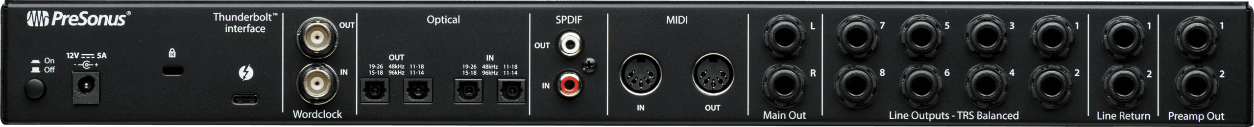 - ADAT Optical/Dual SMUX inputs/outputs: 16×16 channels at 44.1 or 48 kHz; 8×8 channels at 88.2 or 96 kHz