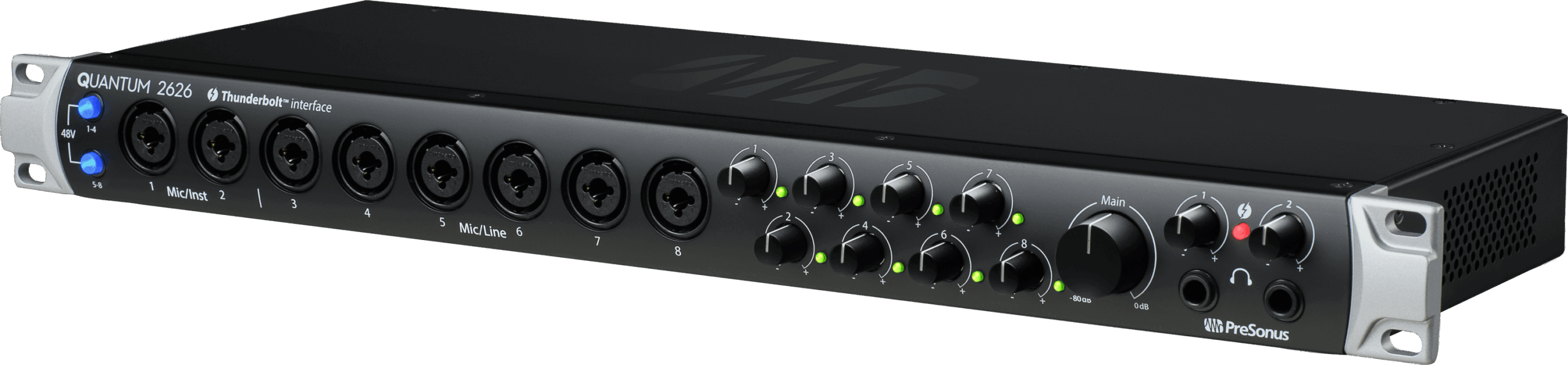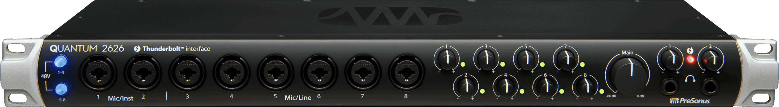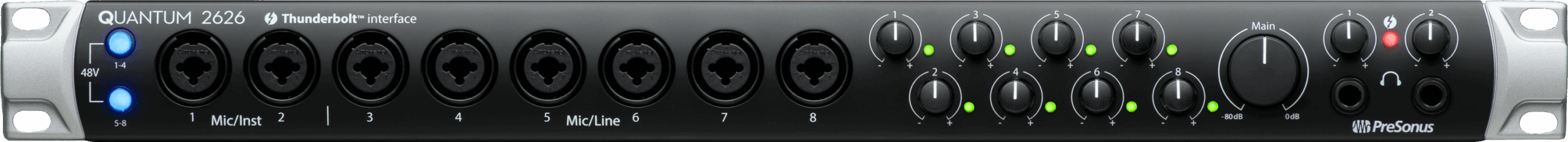 The Quantum 2626 provides up to 26 audio inputs and 26 outputs, with 8 of PreSonus’ lauded XMAX Class A analog microphone preamps. High-quality converters on every analog input and output provide 115 dB of dynamic range, with superior low-jitter clocking, to capture complex musical harmonics smoothly and naturally with no audible distortion. The result is the superb audio quality sought by working professionals. You also get MIDI I/O and BNC word clock I/O that ensures tight sync with other digital audio devices. The interface is well protected by a 1U rack-mountable, rugged, all-metal chassis with metal knobs.