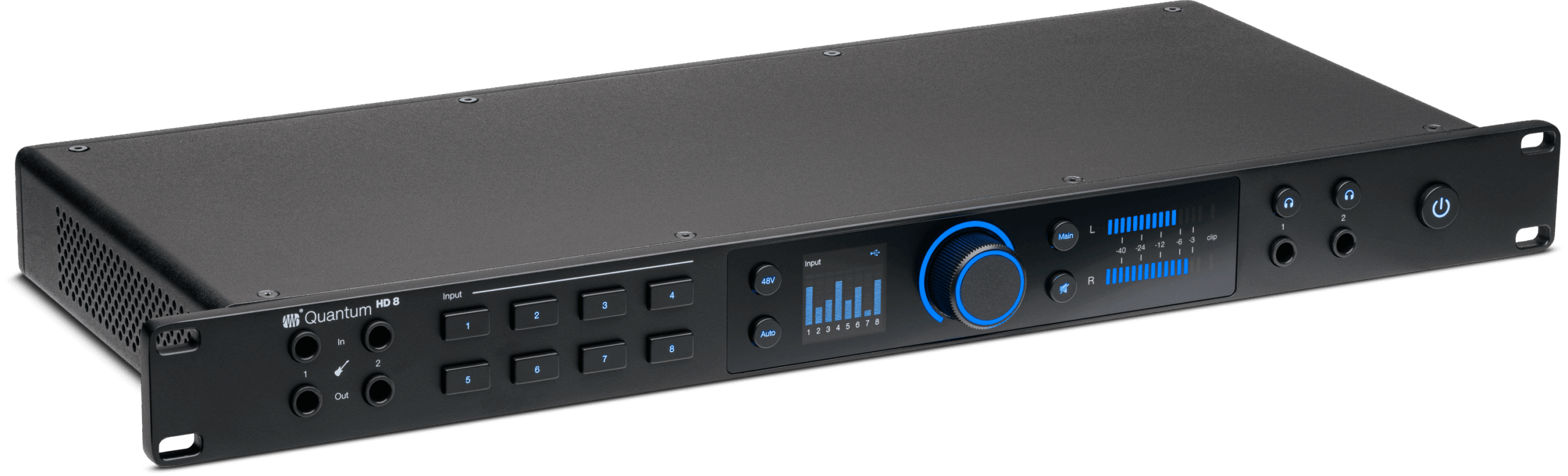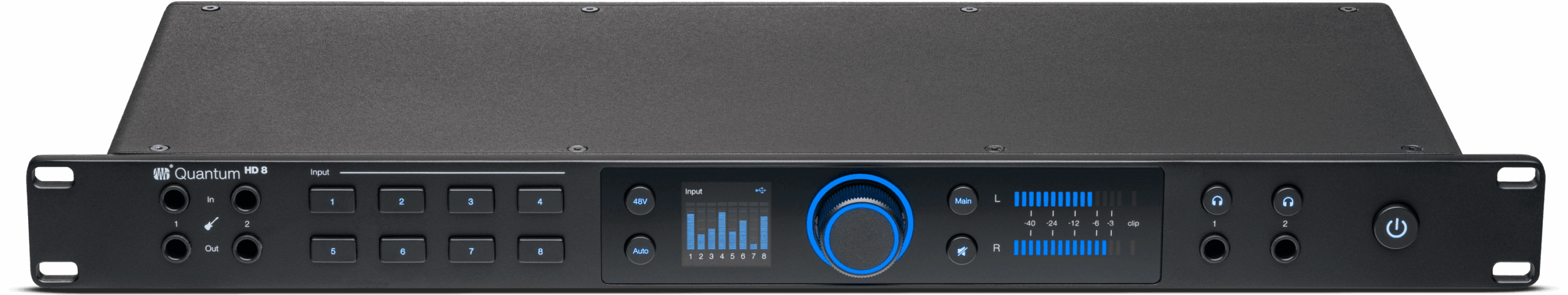 The culmination of 30 years of innovation, the Quantum HD 8 features eight newly redesigned high-definition MAX-HD mic preamps with +75 dB of gain – making it ideally suited for today’s most popular microphones. Guitarists and bassists will love the instrument inputs, which were co-developed with Fender engineers. An Auto Gain button sets the perfect gain level for your microphones and instruments. You also get two re-amp outputs so you can send audio from your DAW to your guitar or bass amp and re-record it to experiment with different amps, pedals, and mic placements. An illuminated push encoder provides flexible control over gain level and output volume, and bright and responsive LED metering provides easy visual feedback for your outputs – making it great for self-produced recording.