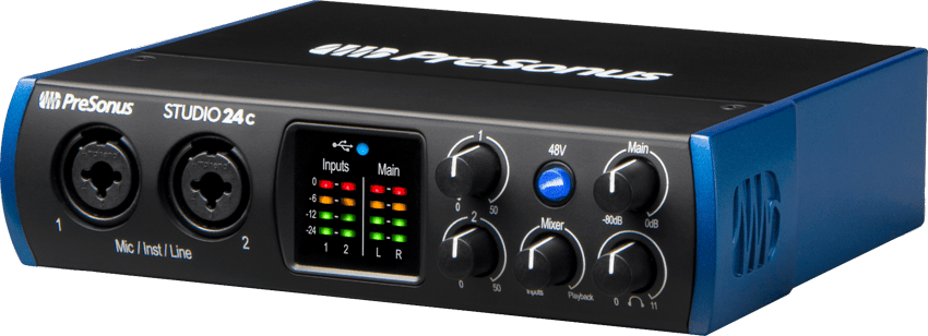Whether you’re recording your first album or your hit podcast’s latest episode, the Studio 24c will help you sound your best. With two of PreSonus®’ pristine XMAX-L mic preamps for recording vocals, high-headroom instrument preamps so you can connect your guitar or bass directly to your interface, and professional input metering so you can keep track of your recording levels, the Studio 24c delivers amazing sound quality in a rugged, compact form factor.