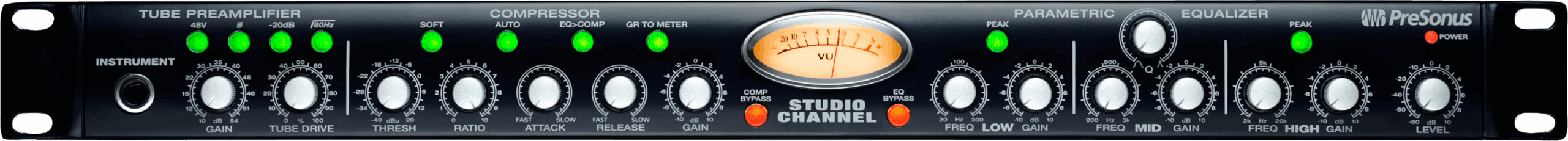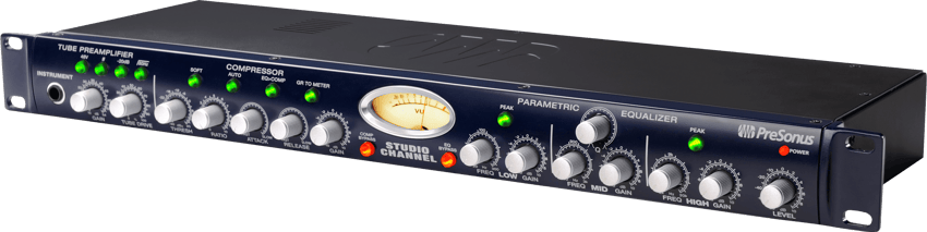 The PreSonus® Studio Channel channel strip is a wonderful studio tool that’s great for live performance, too. Featuring a tube preamp, VCA-based compressor, and three-band EQ, it delivers a huge variety of timbres. With XLR mic, balanced ¼-inch line, and unbalanced ¼-inch instrument inputs and balanced XLR and ¼-inch outputs, you can connect it to almost any audio interface, amp or PA.