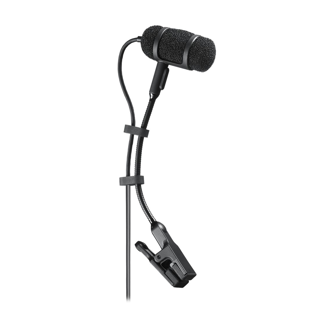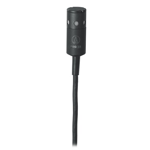 The Audio-Technica PRO35 Cardioid Condenser Clip-On Instrument Microphone is designed for high-SPL applications, ideal for brass, saxophones, toms, and percussion. It delivers exceptional sound clarity and captures subtle performance nuances. The cardioid polar pattern isolates the sound source, reducing unwanted noise from the sides and rear. A 6-foot cable connects to the AT8538 power module, providing an 80 Hz high-pass filter for precise low-frequency control.