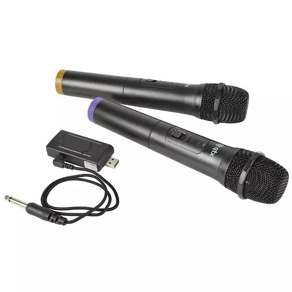 Compact and easy to set up UHF wireless microphone set with 2 handheld transmitters and single USB receiver. The receiver simply plugs into a USB power supply or USB port for power and outputs a mix of both microphones to a 3.5mm jack socket. A plug-through USB connection is provided on the receiver to allow the USB port to continue to be used for connection to media or other USB devices (e.g. for a U-disk mp3 player port). The handheld transmitters are powered by 2 x AA batteries each and operate on 2 UK/EU licence-free UHF frequencies. This system avoids the need for a free-standing or rack-mounted receiver and can operate from a standard USB power supply for ultimate convenience.
