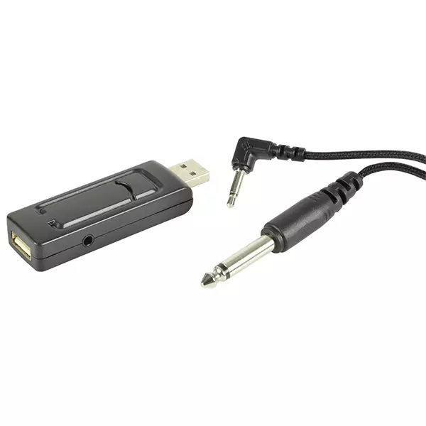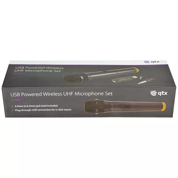 Compact and easy to set up UHF wireless microphone set with a handheld transmitter and USB receiver. The receiver simply plugs into a USB power supply or USB port for power and outputs to a 3.5mm jack socket. A plug-through USB connection is provided on the receiver to allow the USB port to continue to be used for connection to media or other USB devices (e.g. for a USB flash mp3 player port). The handheld transmitter is powered by 2 x AA batteries and operates in one of 2 UK/EU licence-free UHF frequencies. This system avoids the need for a free-standing or rack-mounted receiver and can operate from a standard USB power supply for ultimate convenience.