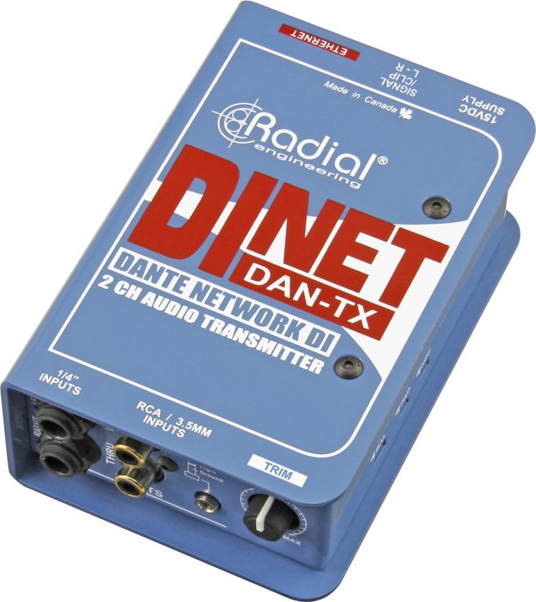 The Radial DiNET DAN-TX is a professional Dante network transmitter designed to convert analogue stereo audio into digital Dante audio for distribution over standard Ethernet networks. It functions as a high-quality stereo DI input to Dante interface, making it ideal for live sound, broadcast, installed AV, and networked audio systems.